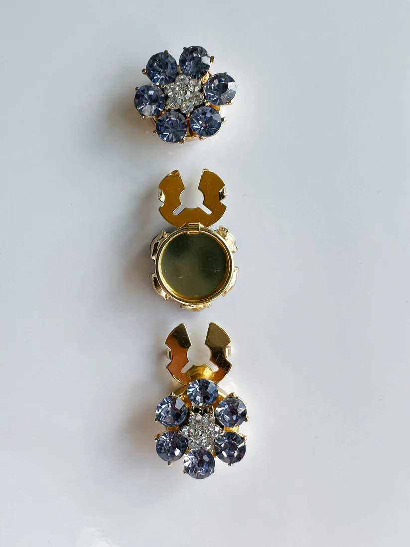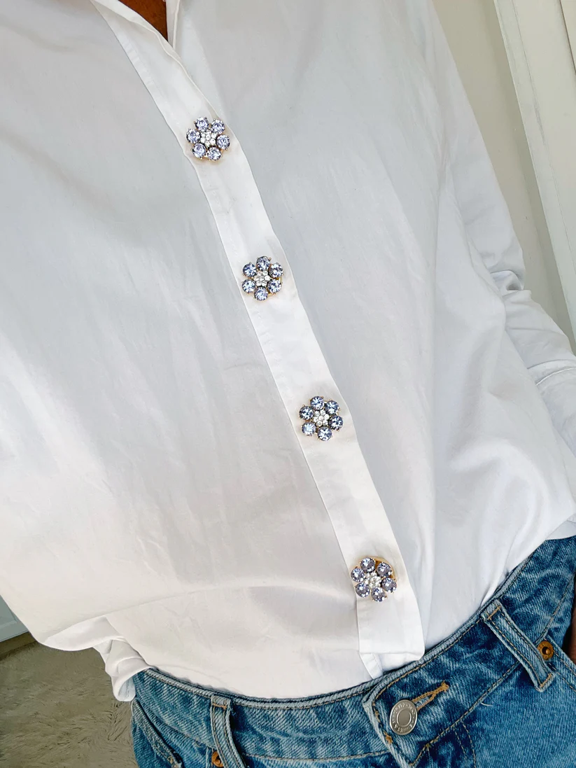 An elegant flower-shaped button charm with a gold-tone base, six larger lilac stones forming the petals, and tiny sparkling white crystals at the center. Designed to add a soft pop of colour, feminine elegance, and a refined sparkle to your outfit. Perfect for shirts, cardigans, blazers, and other buttoned garments.