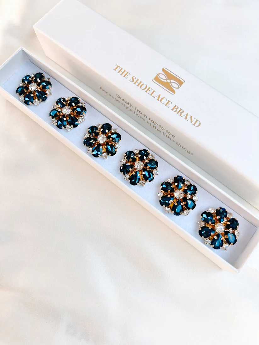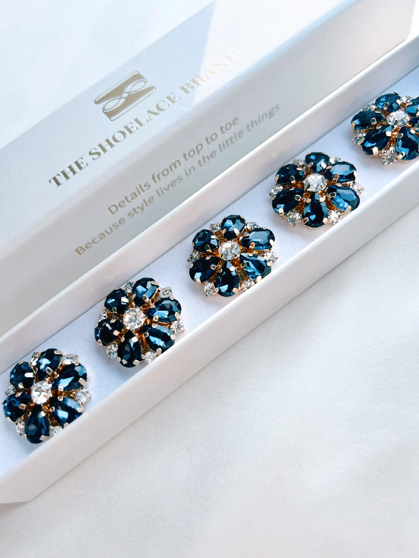 An elegant flower-shaped button charm with a gold-tone base and deep navy and white crystals, designed to add a rich and sophisticated sparkle to your outfit. Perfect for shirts, blouses, and blazers.
