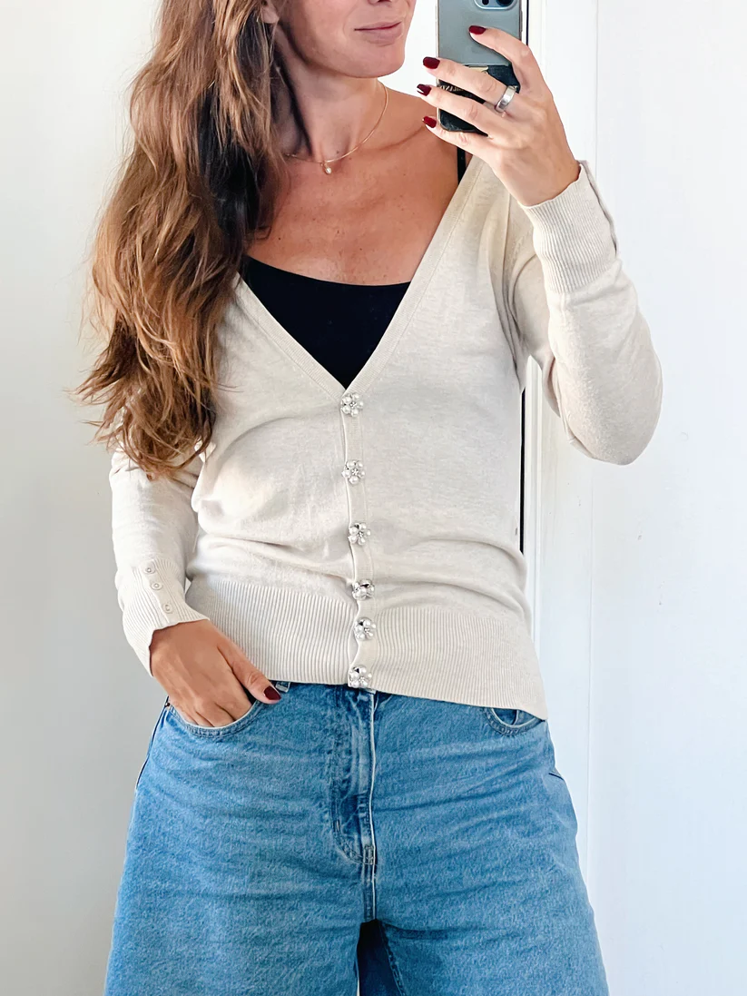 An elegant flower-shaped button charm with a silver-tone base, pearl petals, and a sparkling center of tiny stones. Designed to add classic beauty, soft elegance, and a refined finishing touch to your outfit. Perfect for shirts, cardigans, blazers, and other buttoned garments.