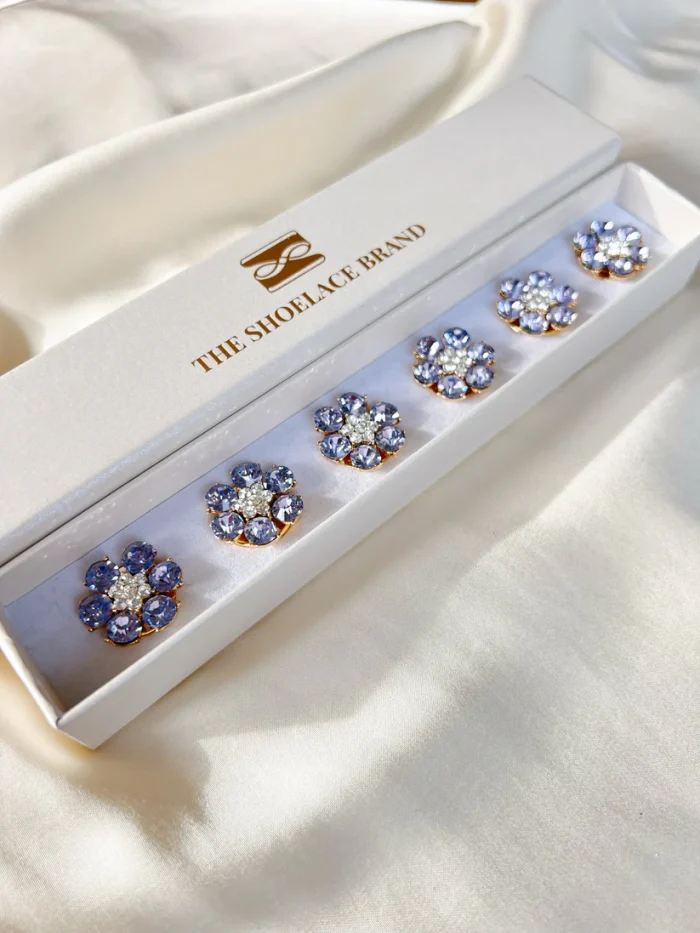 Elegants zieda formas pogas rotājums ar zelta krāsas pamatni, sešiem lielākiem ceriņkrāsas akmentiņiem ziedlapu formā un smalkiem, mirdzošiem baltiem kristāliem centrā. Tas piešķir apģērbam maigu krāsu akcentu, sievišķīgu eleganci un izsmalcinātu mirdzumu. Lieliski piemērots krekliem, kardiganiem, žaketēm un citiem apģērbiem ar pogām.