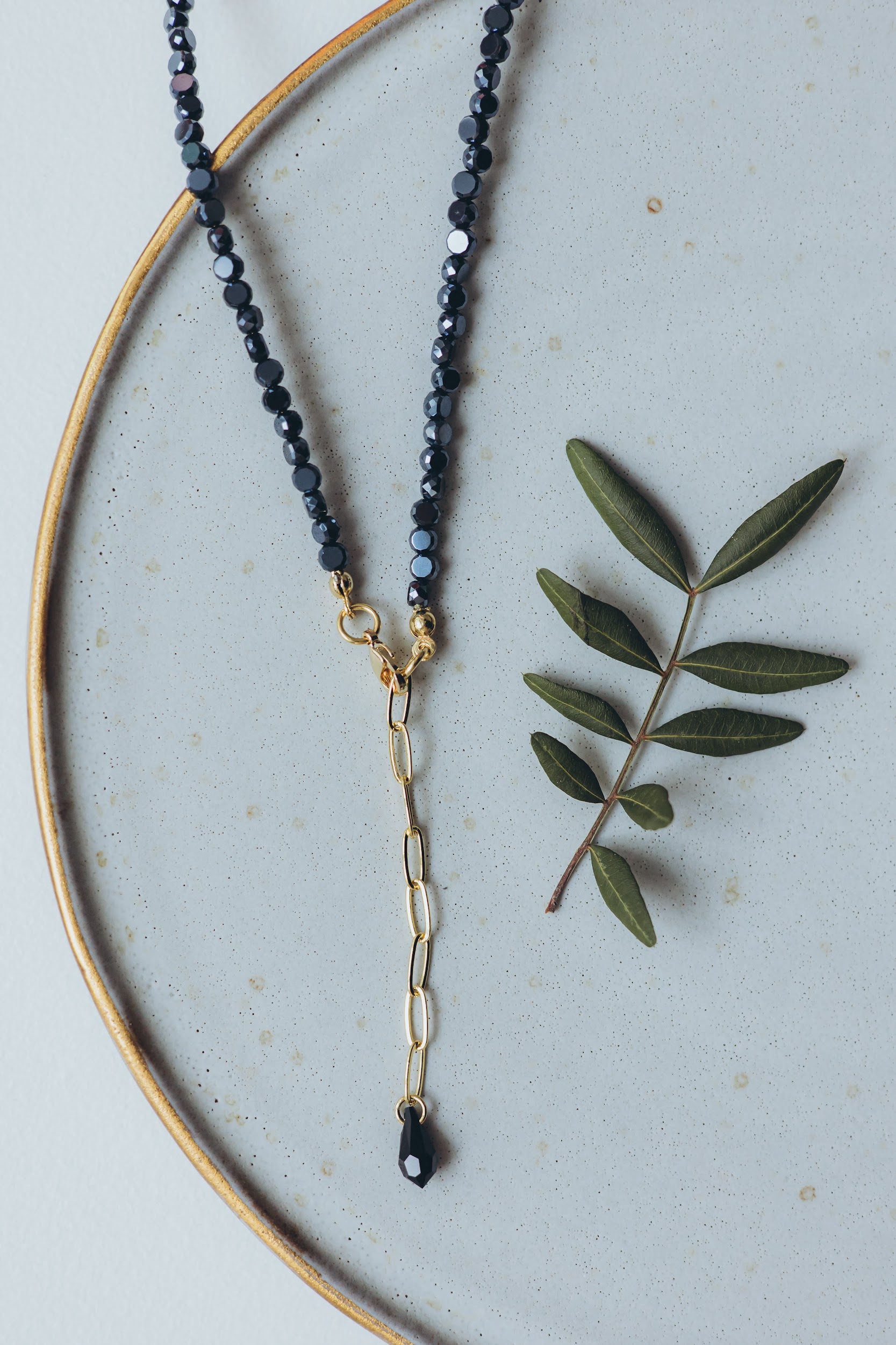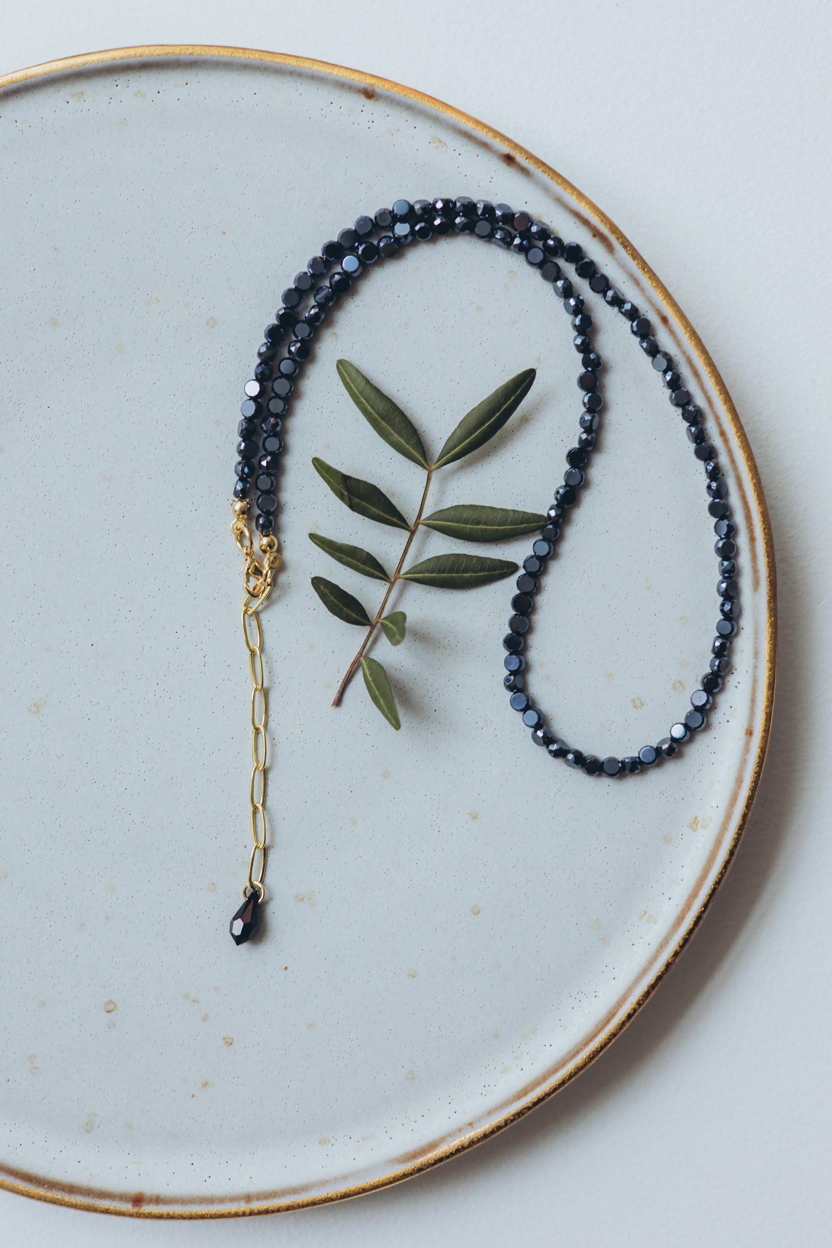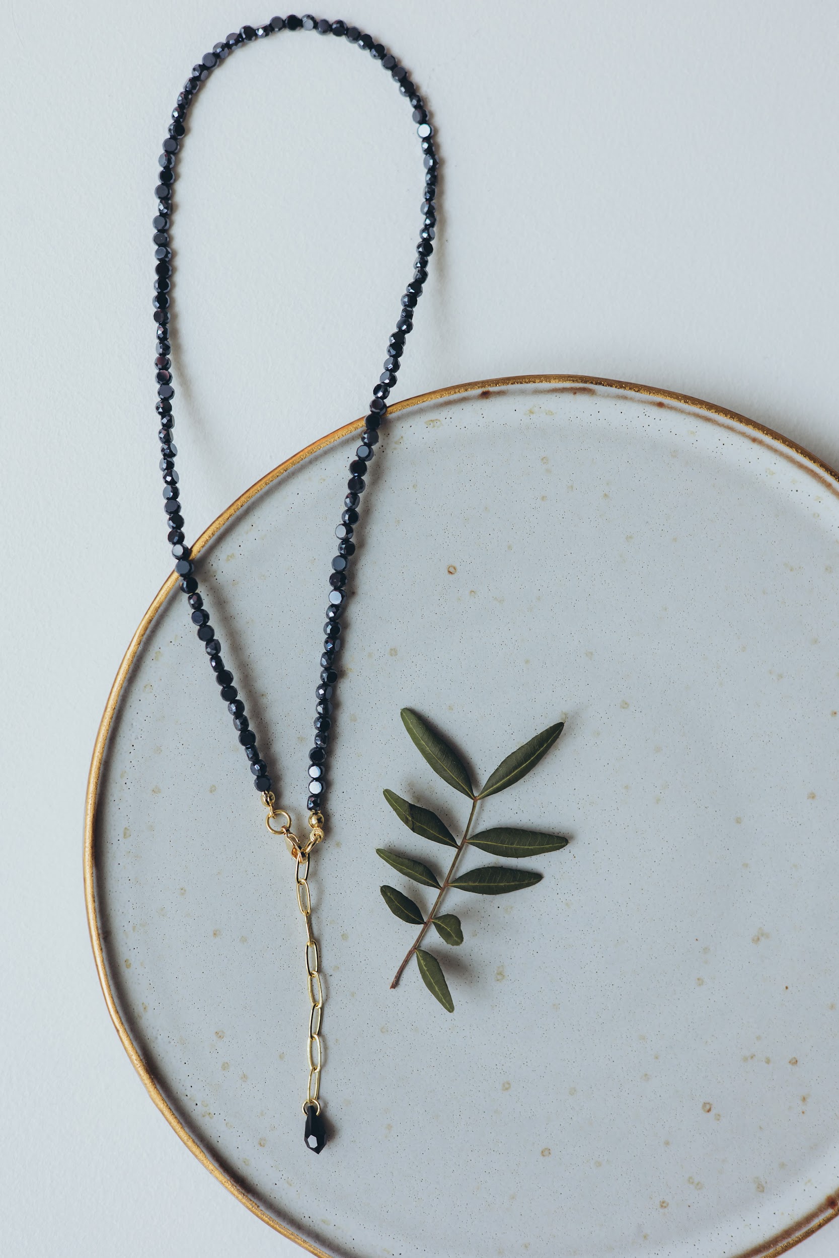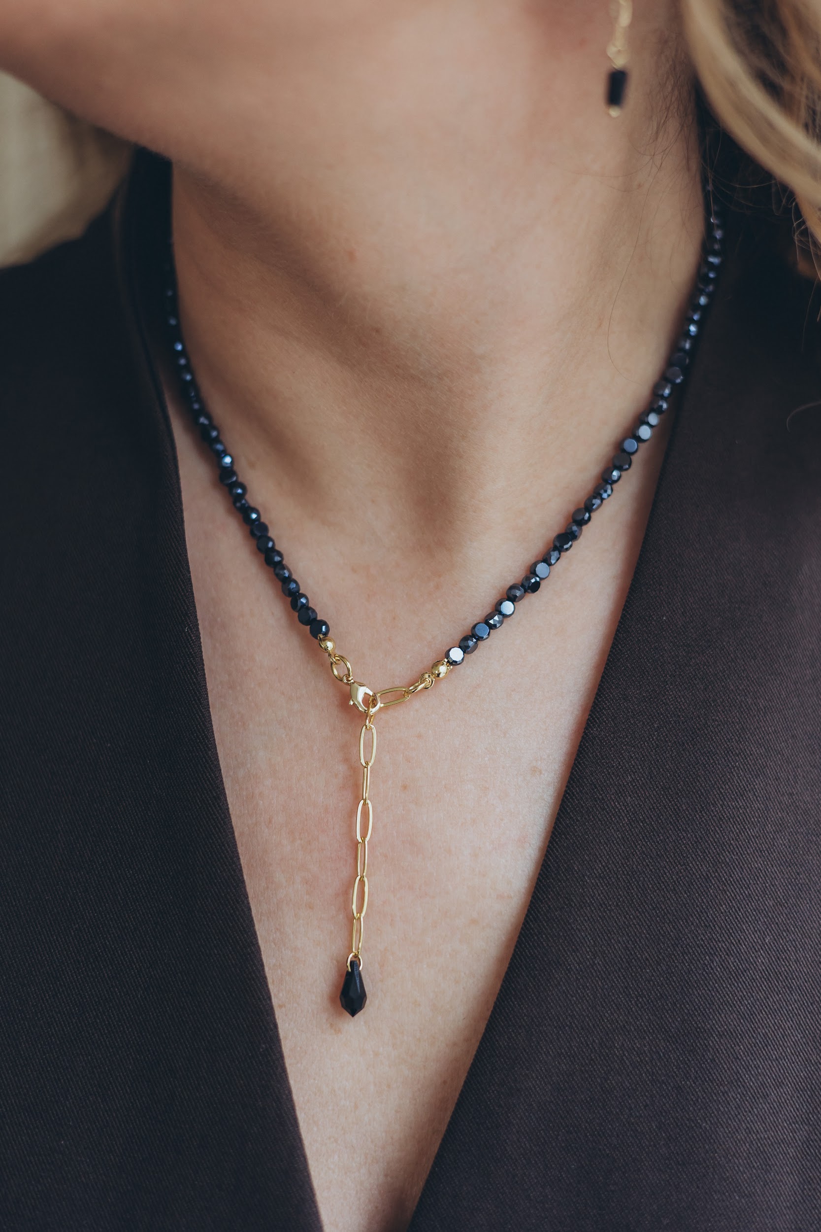 Eleganta kaklarota ar smalki slīpētiem stikla kristāliem, kas maigi atstaro gaismu un piešķir rotai izteiksmīgu, bet atturīgu mirdzumu. Tumšie kristāli rada dziļuma efektu, savukārt zelta toņa ķēdītes elements ar dekoratīvu kristāla piekariņu piešķir modernu un sievišķīgu akcentu.